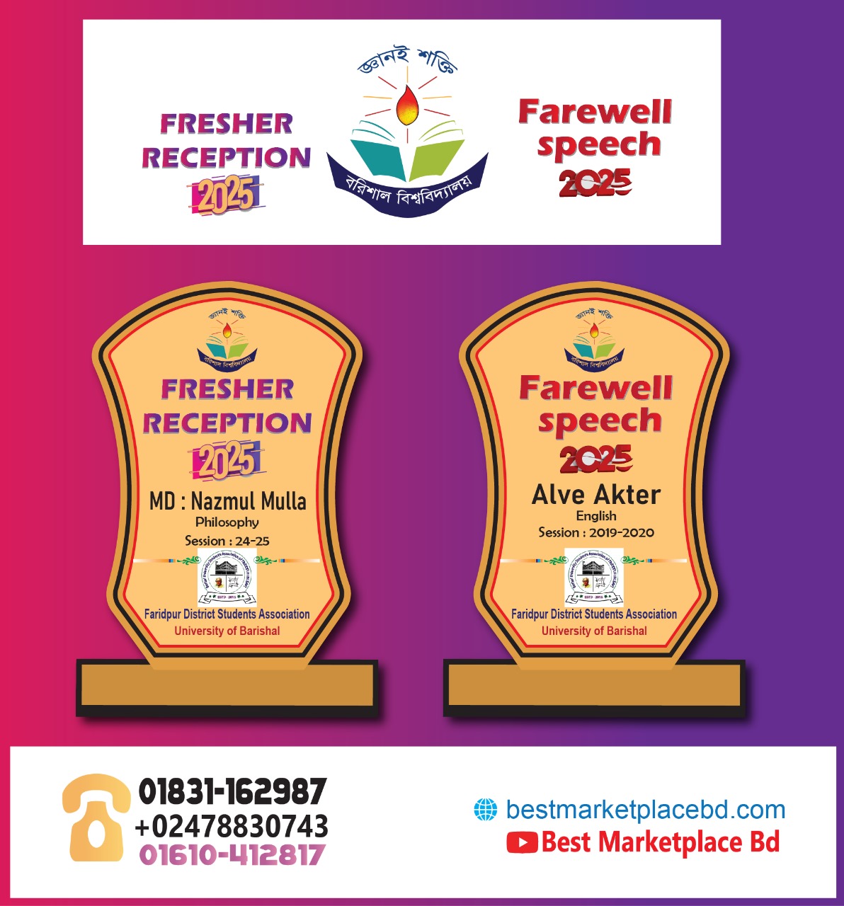 এটি একটি ডেমো পিকচার, এভাবে  আপনার প্রোগ্রামের বিষয় / প্রতিষ্ঠানের নাম, লোগো, ছবি, লেখা দিয়ে প্রিন্ট করিয়ে নিতে আপনার প্রয়োজনীয় পরিমান অনুযায়ী  অর্ডার করুন। অর্ডার করার পূর্বে পণ্যের বর্তমান মূল্য ও স্টক নিম্ন লিখিত নাম্বারে কল করে জেনে নিন এবং যা প্রিন্ট করাতে চান ( নাম, লোগো, কিংবা অন্য কোনো লেখা,ছবি , তা আমাদের হোয়াটসঅ্যাপ বা ওয়েবসাইটের ম্যাসেজ অপশনে লিখে / ড্রাফ আকারে ছবি দিন অথবা সরাসরি ফোন কল করে বলুন  ।