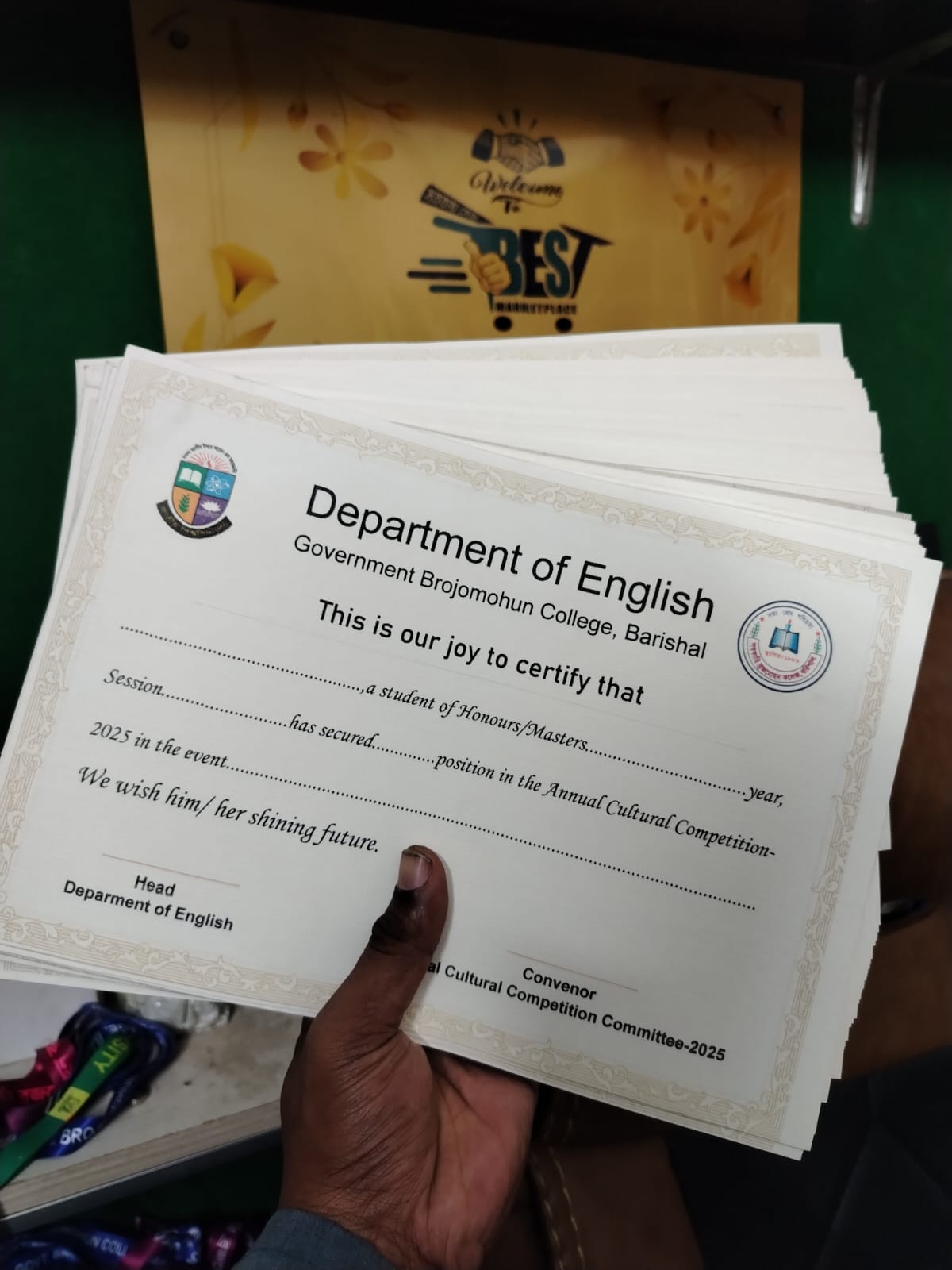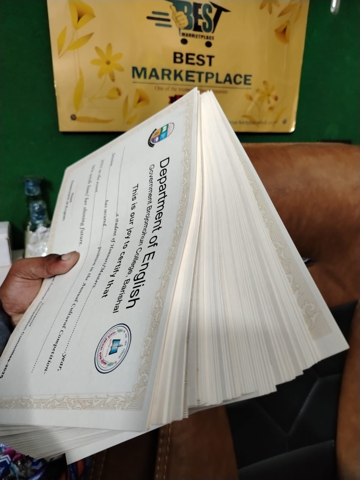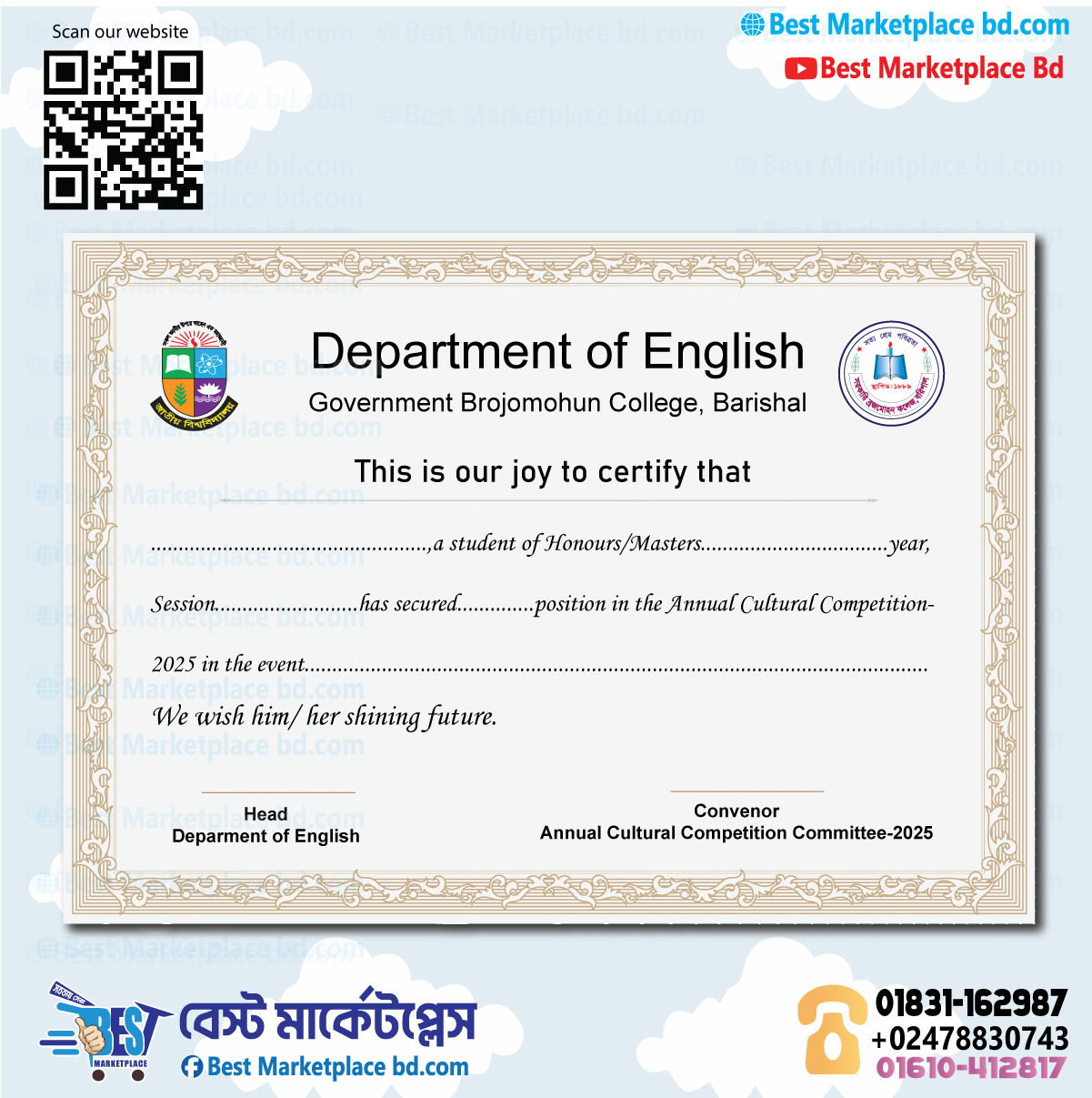 Best Marketplace bd.com প্রস্তুত করে দেয় সম্পূর্ণ কাস্টমাইজড সার্টিফিকেট — আপনি যে কোনো টেক্সট, বিভাগ/বিভাগের নাম, লোগো এবং অফিসিয়াল সিল/স্বাক্ষর কোরে দিতে পারবেন। আমরা প্রফেশনাল প্রিন্টিং এবং কাগজ মানের উপর গুরুত্ব দিয়ে থাকি — দ্রুত ডেলিভারি ও কম দামে।